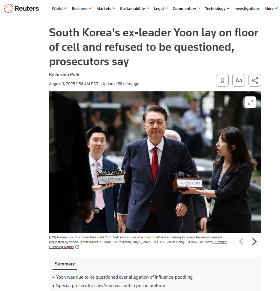 미국 뉴스 1면에 이렇게 더러운 한국 뉴스로 장식하게 하다니, 한국 전직 대통령이 조사를 거부하고 구치소 방바닦에 누워 버텼다라는 뉴스가 1면을 장식했다. 이 뉴스를 읽는 이들에게는 대한민국이 아프리카의 어느 구석 나라정도로 인식하게 만들고 있다.우리에게 모욕감을 주는 것은 물론, 국격을 땅에 쳐박고 있다. 물론 대통령있는것 보다 100배 1000배 낫지만, 윤석열, 김건희, 그들에게 부역한 자들에게 진짜 분노가 치민다.